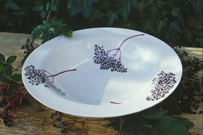 Meine großen Schalen von ca. 60-66cm fertige ich mit Motiven der Jahreszeiten von Hand. Ich male Mohn, Holunder, Brombeeren und Rittersporn nach eigenen Skizzen und Aquarellen aus der Natur.